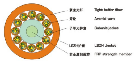 多芯分支光纜使用6芯、12芯子單元光纜(0.9mm緊套光纖、芳綸加強(qiáng)元件)作為子單元,非金屬中心加強(qiáng)芯,光纜子單元圍繞中心加強(qiáng)芯形成纜芯,***外擠制一層聚氯乙烯(PVC)或低煙無鹵(LSZH)材料護(hù)套而成。